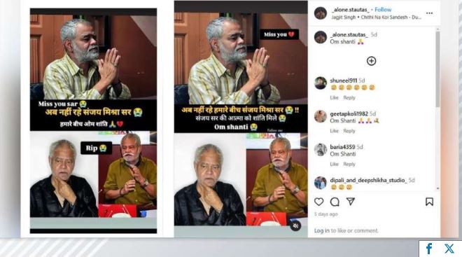 फैक्ट चेक में यह पूरी तरह से साफ हो गया है कि संजय मिश्रा बिल्कुल स्वस्थ हैं और अपनी नई फिल्म ‘धमाल 4’ की शूटिंग में व्यस्त हैं। उनके निधन की खबर पूरी तरह फर्जी और भ्रामक है। सोशल मीडिया पर इस तरह की खबरें फैलाने वालों पर सख्त नजर रखने की जरूरत है।