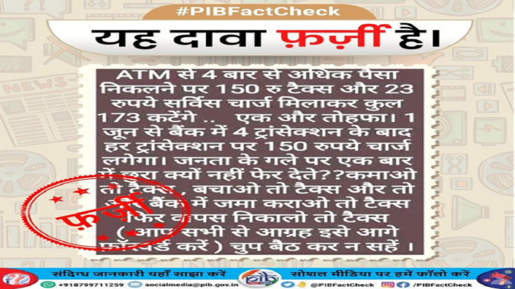 सोशल मीडिया पर इन दिनों एक मैसेज वायरल हो रहा है। दावा किया जा रहा है कि एटीएम से चार बार से ज्यादा कैश निकालने पर खाते से 173 रुपये कट जाएंगे। यह संदेश ट्विटर पर साझा किया गया है। इसमें कहा गया है कि एटीएम से चार नकद निकासी पर 150 रुपये का कर और 23 रुपये का सेवा शुल्क 173 रुपये लगेगा। ये नियम 1 जून से लागू हैं। इस संदेश में सरकार की कार्यशैली की आलोचना की जा रही है. महंगाई की शिकायत की जा रही है। लेकिन जब पीआईबी फैक्ट चेक ने मैसेज चेक किया तो यह फर्जी निकला। पीआईबी की फैक्ट चेक टीम ने बताया कि आपके बैंक से हर महीने पांच फ्री ट्रांजैक्शन किए जा सकते हैं। बाद के लेनदेन में अधिकतम 21 रुपये की कटौती की जाएगी। अलग से कोई टैक्स नहीं देना होगा। पीआईबी ने वायरल मैसेज को लेकर एक आधिकारिक ट्वीट किया है। उनके ट्वीट में लिखा है कि इस वायरल मैसेज में किया गया दावा पूरी तरह से गलत है. पीआईबी की टीम का कहना है कि ऐसे मैसेज से दूर रहने के लिए मैसेज में दिए गए लिंक पर क्लिक करने से आप फ्रॉड का शिकार हो सकते हैं।